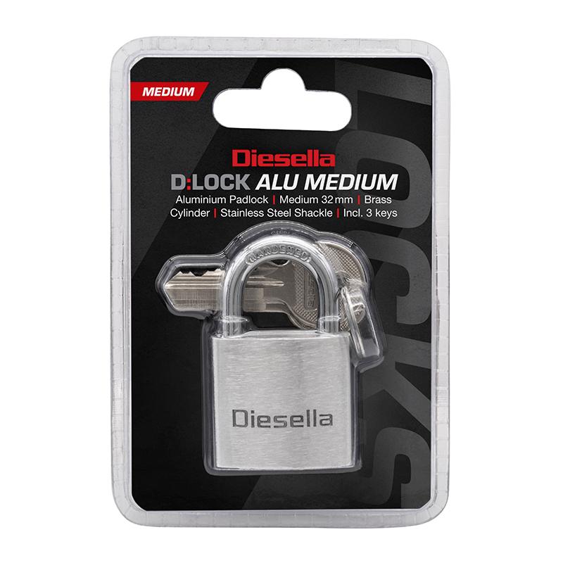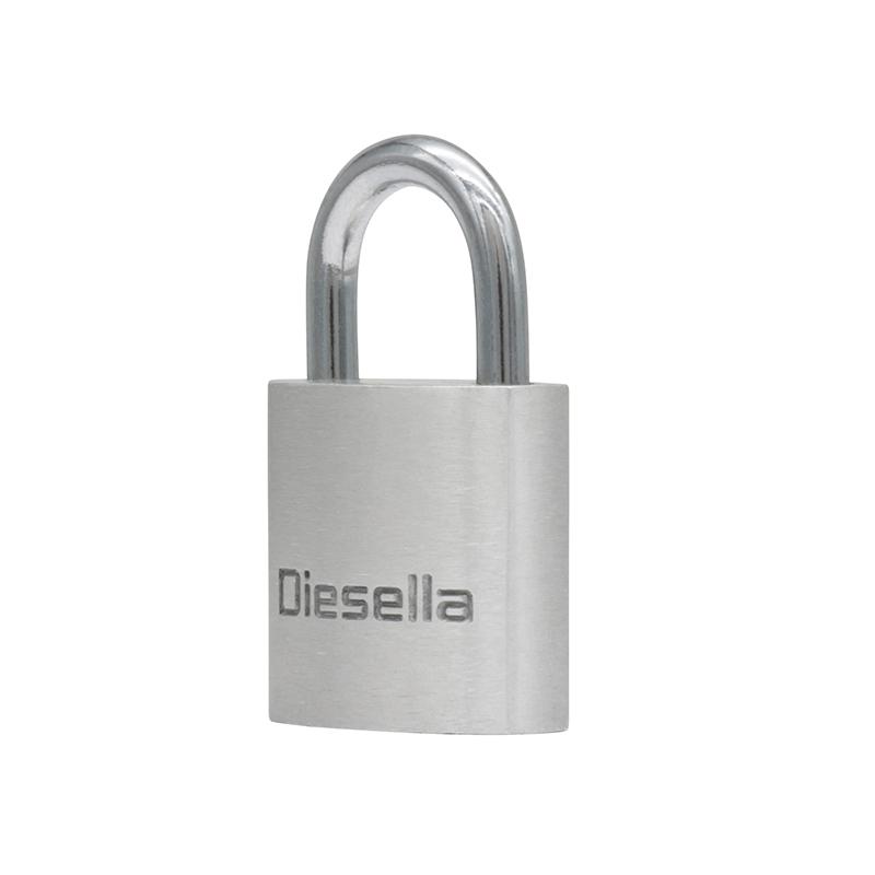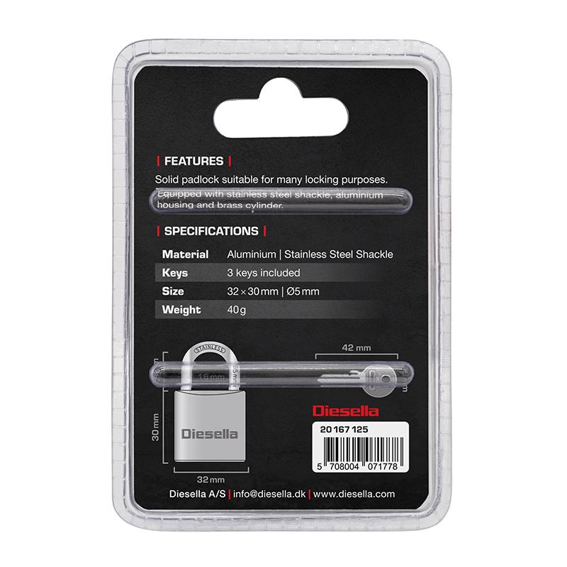 Forsynet med stålbøjle, hus i aluminium og cylinder i messing og medfølger 3 stk. nøgler.