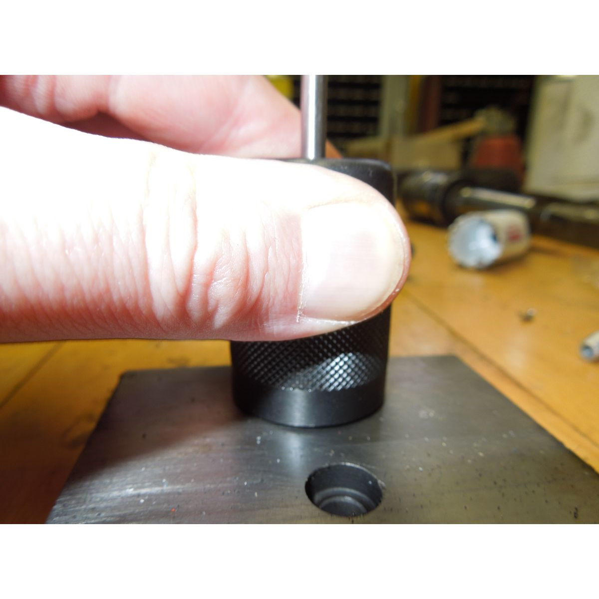 Du placerer det fjederbelastede koniske stykke over hullet og trykker ned. Kørneren er hermed centeret i hullet og klar til brug i emnet/skabelonen.