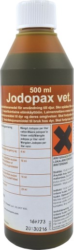 - Jodopax vet. iodofor der indeholder 5 % iod. Iodofor er et kompleks mellem et tensid og iod.